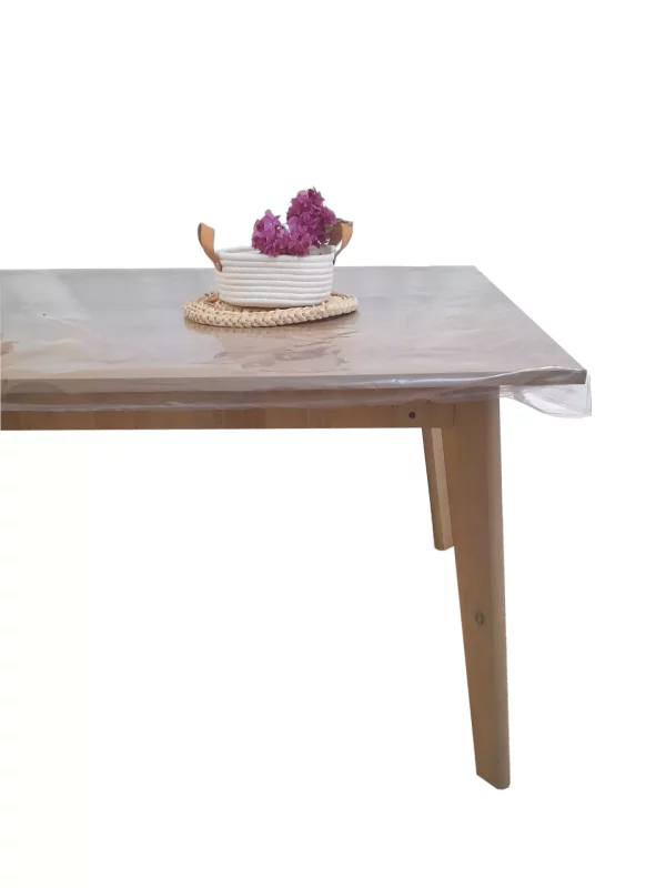 Usamos pvc transparente grueso de 450 micrones, un plástico impermeable, resistente y muy fácil de limpiar, que te permite lucir tu mesa y a la vez protegerla.